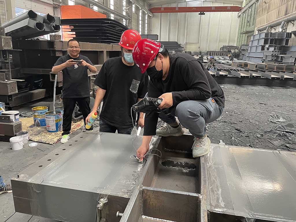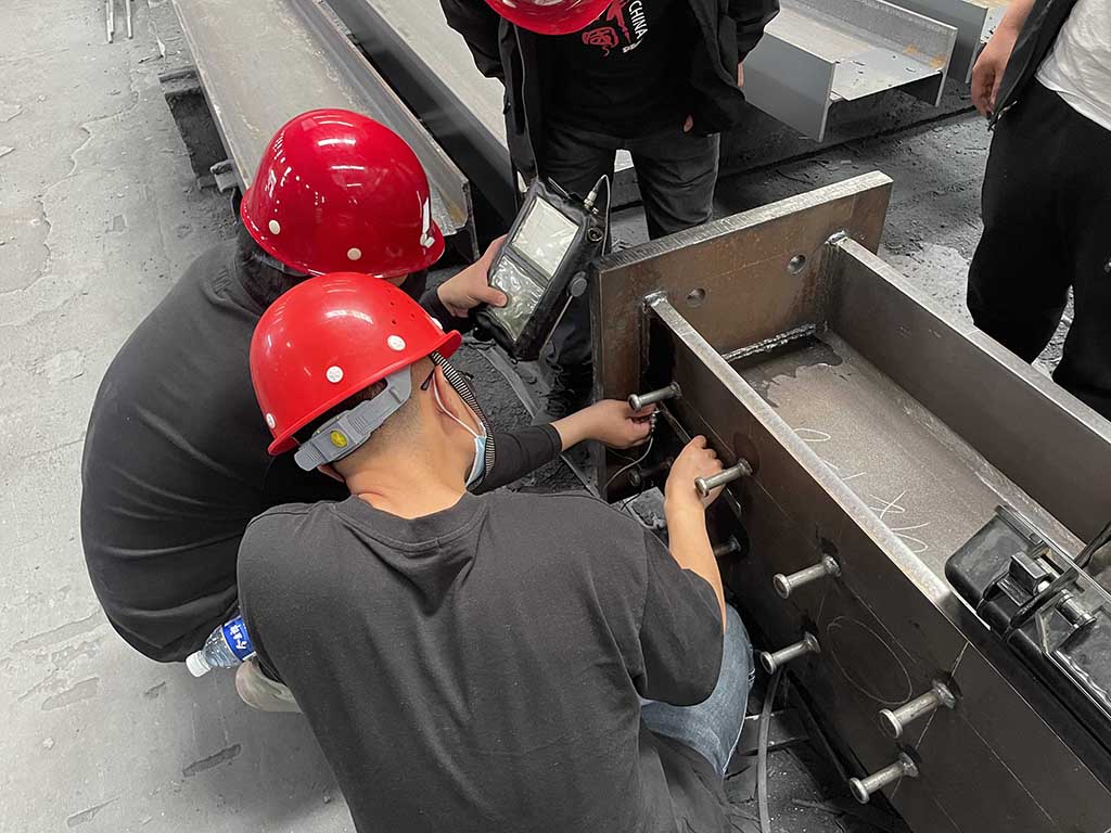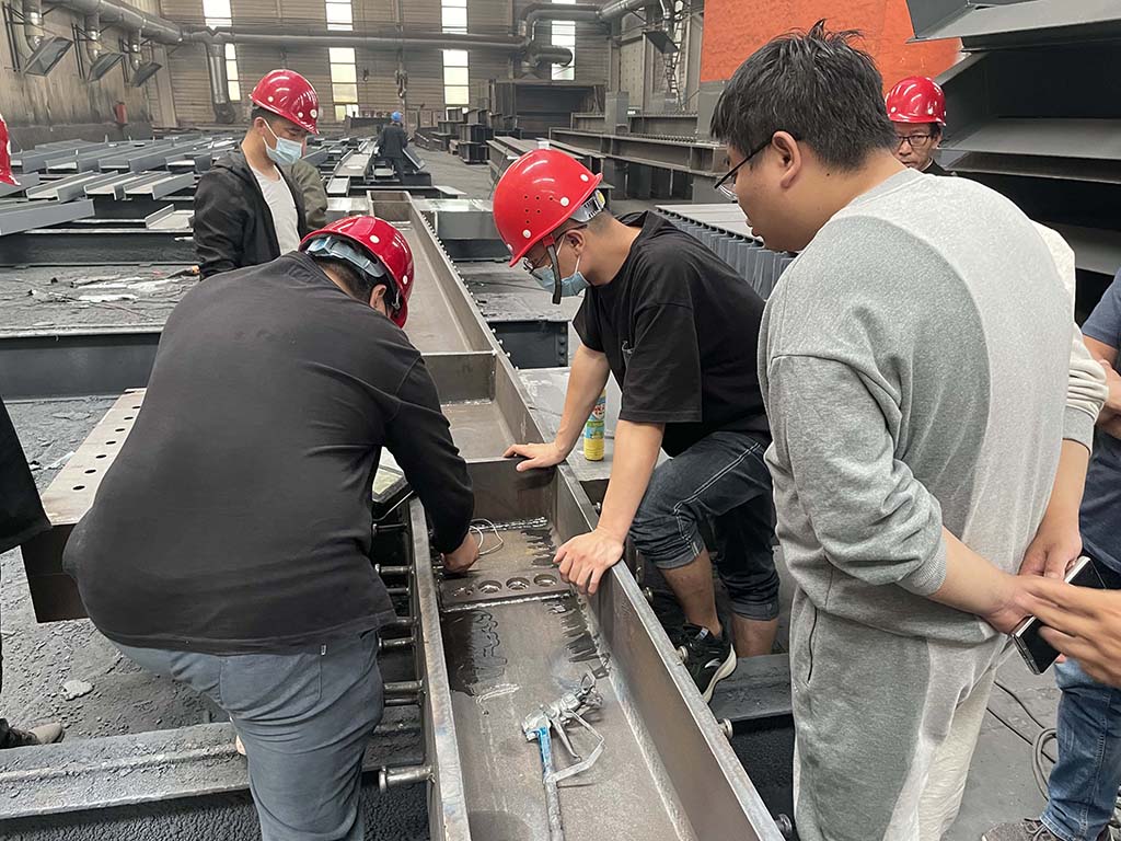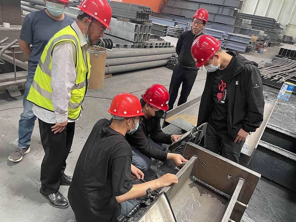 2022 年5月19日,河北建工集團(tuán)鋼結(jié)構(gòu)工程有限公司項(xiàng)目負(fù)責(zé)人李夢(mèng)蒞臨涿鹿博泰鋼結(jié)構(gòu)工程有限公司考察指導(dǎo)工作,隨行人員有項(xiàng)目監(jiān)理以及實(shí)驗(yàn)室工作人員,只有河北公安警察職業(yè)學(xué)院新校區(qū)暨省公安民警訓(xùn)練地建設(shè)項(xiàng)目探傷,焊縫等級(jí)進(jìn)行了現(xiàn)場(chǎng)檢測(cè),取得了預(yù)期的效果,公司常務(wù)副總范清輝及副總經(jīng)理范國(guó)帥全程接待并講解了博泰鋼構(gòu)的設(shè)備及工藝。